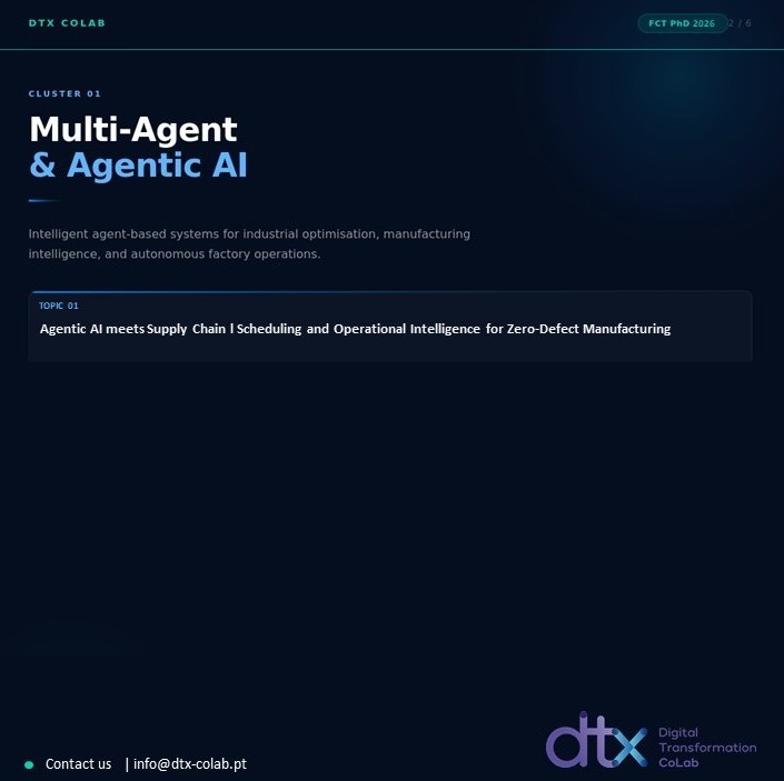 Investigates how agentic AI systems can support optimisation across DTx network of partners (supply chains, manufacturing systems, and workforce coordination). The research will explore agent-based scheduling, planning, and decision-support systems capable of continuous optimisation in industrial environments. By integrating ML, optimisation methods, and industrial data streams, the project aims to enable operational intelligence, adaptive production scheduling, and optimising industrial ecosystems aligned with the intelligent factories.
