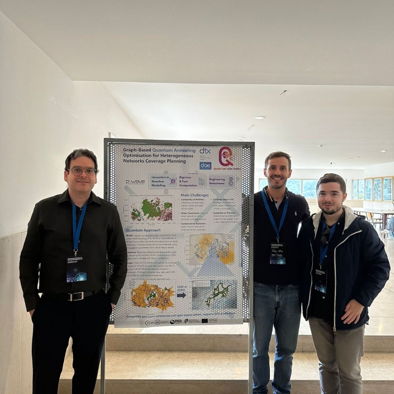 Em representação do DTx, estiveram os investigadores do grupo DAE, Jean Gomes, Marcelo Alves e Guilherme Martins que apresentaram o trabalho “Graph-Based Quantum Annealling Optimization for Heterogeneous Networks Coverage Planning” e tiveram a oportunidade de partilhar experiências e trocar ideias com alguns dos especialistas de referência presentes no evento, entre eles Almudena Justo Martínez (Fujitsu), Helena Alberto (Universidade de Coimbra) e Christoph Ribeiro (Softinsa).
